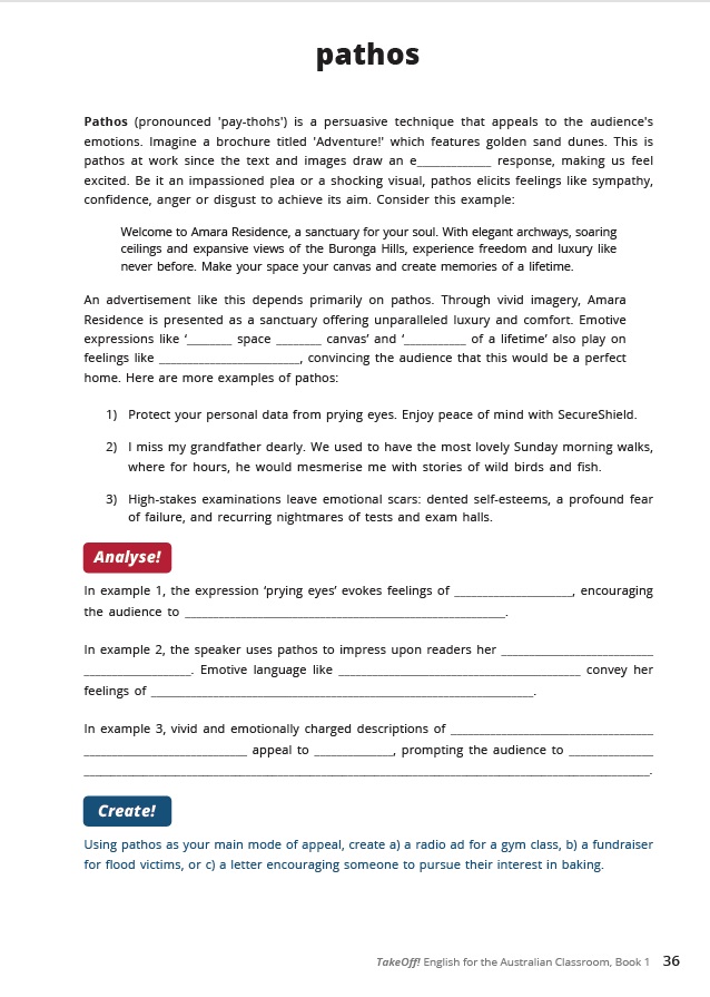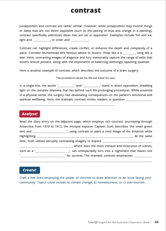 Powered by glorious visuals and innovative pedagogy, Takeoff! English for the Australian Classroom is a one-of-a-kind workbook series for high school students in their middle to upper years. Designed to complement the Australian curriculum, Book 1 invites users on an exhilarating journey through three key areas of competencies: language techniques, creative writing and literary analysis. With its progressive structure, high-interest texts and practical approach, Takeoff! is bound to teach, inspire and delight.