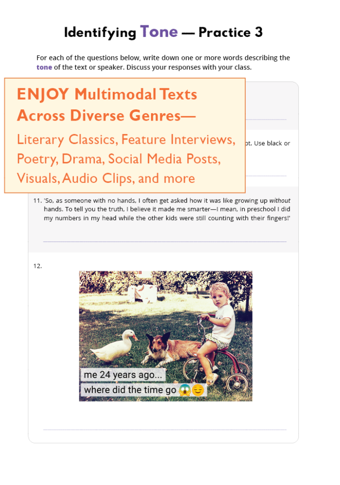 - Wide-ranging text types including prose, poetry, speeches, visuals, radio advertisements, internet forums, audio clips and more